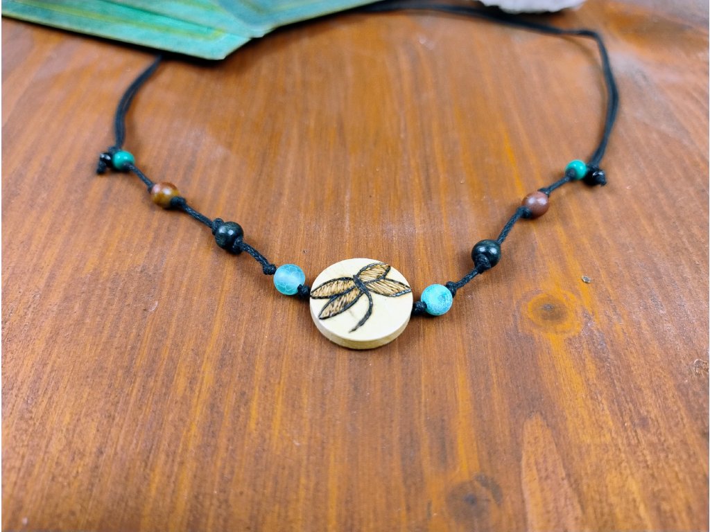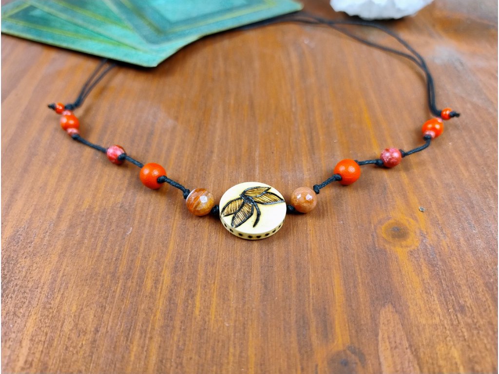Ručně gravírovaný dřevěný přívěsek s motivem inspirovaným přírodou, obohacený o minerální korálky.