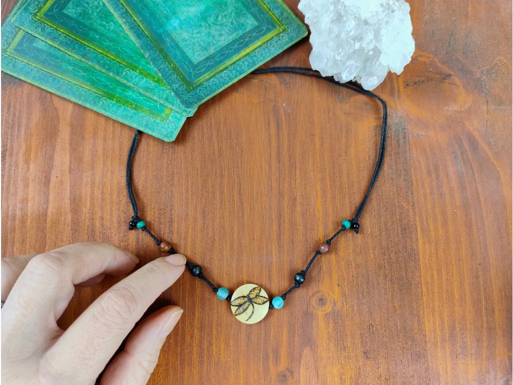 Ručně gravírovaný dřevěný přívěsek s motivem inspirovaným přírodou spolu s minerály tvoří originální náhrdelník, který podtrhne vaší jedinečnost. Společně dáte světu najevo, že vám na přírodě záleží a že máte divokou duši....A to není málo!