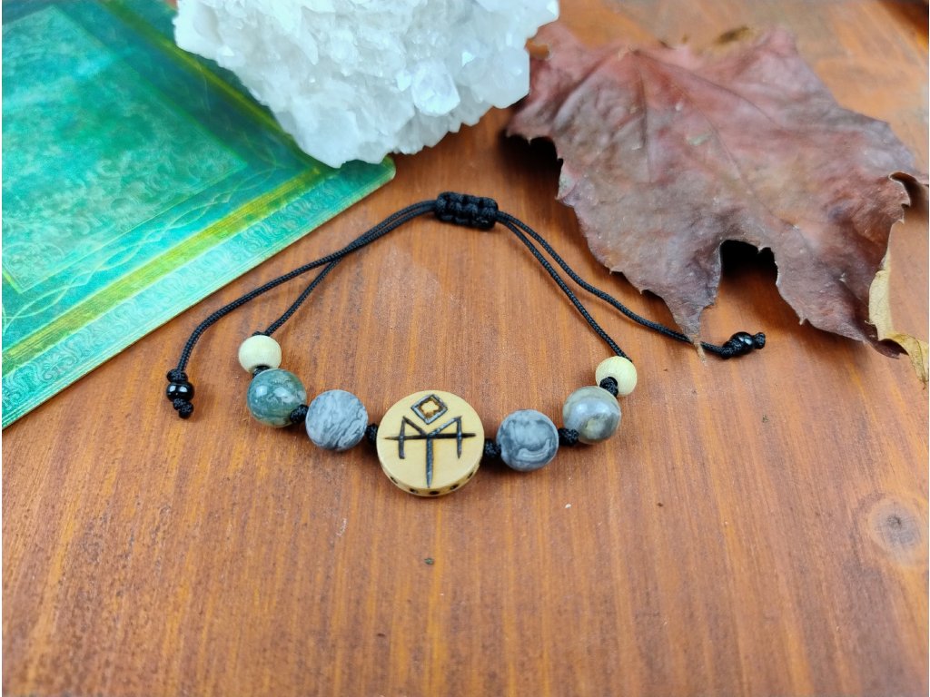Středem náramku je ručně vypalovaný dřevěný korálek – vzniká pomalu, bez šablon a díky tomu je každý kousek originál. Minerální korálky ho doplňují a vyvažují.