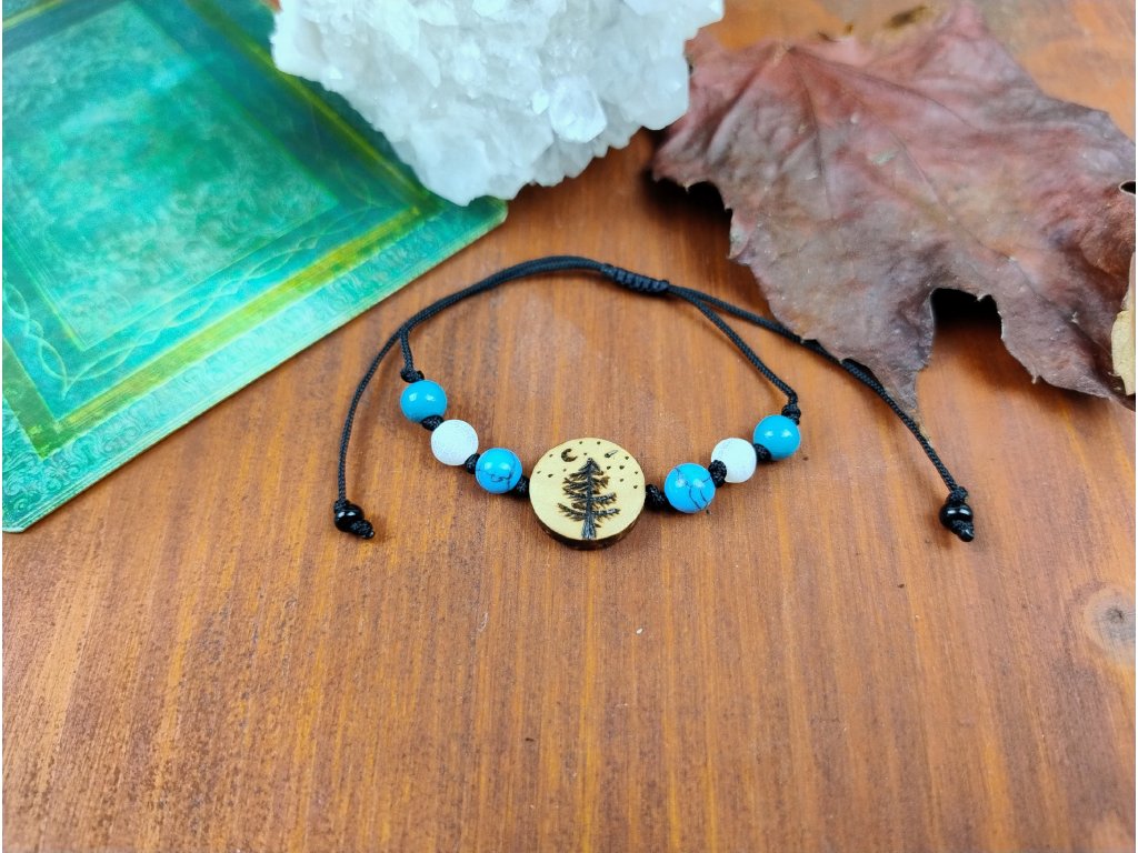 Středem náramku je ručně vypalovaný dřevěný korálek – vzniká pomalu, bez šablon a díky tomu je každý kousek originál. Minerální korálky ho doplňují a vyvažují.