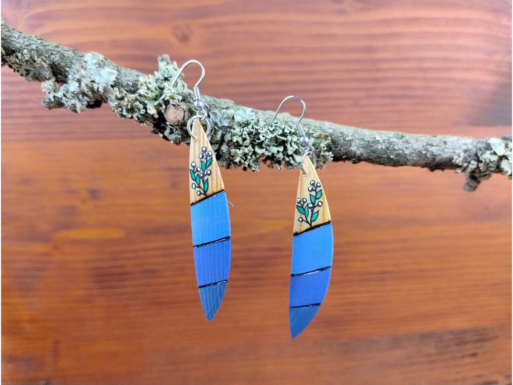 Náušnice z modřínového dřeva s ručním  vypalováním a malbou.