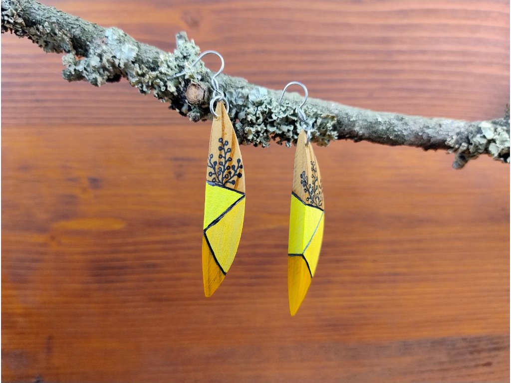 Tyto ručně vyráběné visací náušnice z modřínovího dřeva spojují přírodní krásu s precizním řemeslným zpracováním. Každý pár je jedinečný díky ruční malbě a gravírování, které vytvářejí jemné motivy inspirované přírodou.
