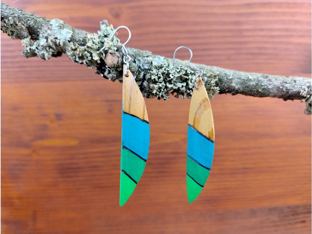 Náušnice z modřínového dřeva s ručním  vypalováním a malbou.